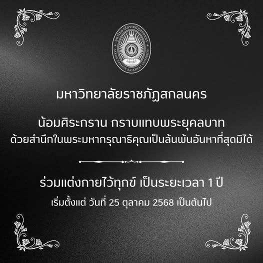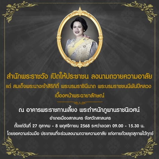 สำนักพระราชวัง เปิดให้ประชาชน ลงนามถวายความอาลัย แด่สมเด็จพระนางเจ้าสิริกิติ์ พระบรมราชินีนาถ พระบรมราชชนนีพันปีหลวง เบื้องหน้าพระฉายาลักษณ์ ณ อาคารพระราชทานเลี้ยง พระตำหนักภูพานราชนิเวศน์ อำเภอเมืองสกลนคร จังหวัดสกลนครตั้งแต่วันที่ 27 ตุลาคม – 8 พฤศจิกายน 2568 ระหว่างเวลา 09.00 – 15.30 น.