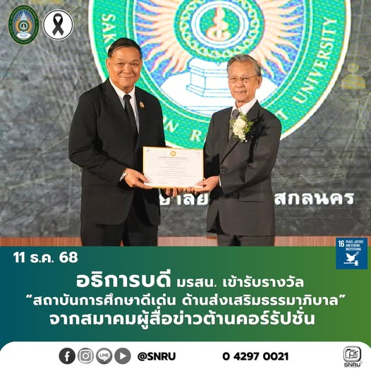อ่านเพิ่มเติม “การประชุมคณะกรรมการบริหารมหาวิทยาลัยราชภัฏสกลนคร (กบ.) และ คณะกรรมการบริหารบุคคลในมหาวิทยาลัยราชภัฏสกลนคร (กบม.) ครั้งที่ 12/2568”วันที่ 11 ธันวาคม 2568 ผศ.ชาคริต ชาญชิตปรีชา อธิการบดีมหาวิทยาลัยราชภัฏสกลนคร เข้าร่วมพิธีมอบรางวัล “ANTI-CORRUPTION AWARDS 2025” ณ อาคารอเนกประสงค์ ชั้น 2 สถาบันวิชาการป้องกันประเทศ ถนนวิภาวดีฯ กรุงเทพมหานคร ซึ่งจัดโดย สมาคมผู้สื่อข่าวต้านคอร์รัปชั่น (ประเทศไทย) และได้รับเกียรติจาก ฯพณฯ ชวน หลีกภัย อดีตนายกรัฐมนตรี เป็นประธานกล่างเปิดงาน พร้อมทั้งกล่าวปาฐกถา ในหัวข้อ “คอร์รัปชั่น มหันตภัยทำลายชาติ” และ ดร.เอก์ เหลืองสะอาด นายกสมาคมผู้สื่อข่าวต้านคอร์รัปชั่นฯ และประธานสภาธรรมาภิบาลสื่อมวลชนแห่งชาติ กล่าวรายงาน จากนั้นเป็นพิธีมอบโล่เชิดชูเกียรติ “ANTI-CORRUPTION AWARDS 2025” ในโอกาสนี้ มหาวิทยาลัยราชภัฏสกลนคร ได้เข้ารับเกียรติบัตรในฐานะ “สถาบันการศึกษาดีเด่น ด้านส่งเสริมธรรมาภิบาล” ซึ่งแสดงถึงการเป็นสถาบันการศึกษาที่ยึดหลักธรรมาภิบาล และบริหารงานด้วยความโปร่งใส