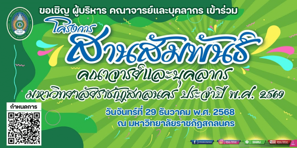 ขอเชิญชวน ผู้บริหาร คณาจารย์และบุคลากร มรสน. เข้าร่วมโครงการ “สานสัมพันธ์ คณาจารย์และบุคลากร มหาวิทยาลัยราชภัฏสกลนคร” ประจำปี พ.ศ.2569 ในวันจันทร์ที่ 29 ธันวาคม 2568 ณ มหาวิทยาลัยราชภัฏสกลนคร