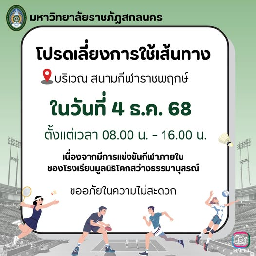 ประกาศเลี่ยงการใช้เส้นทาง เผยเเพร่เมื่อ ธันวาคม 2, 2568ธันวาคม 2, 2025 โดย มัลลิกาล์ สินธุระวิทย์ 3 เข้าชม ประกาศเลี่ยงการใช้เส้นทาง บริเวณสนามกีฬาราชพฤกษ์ ในวันที่ 4 ธันวาคม 2568 ตั้งแต่เวลา 08.00 น. – 16.00 น. เนื่องจากมีการแข่งขันกีฬาภายในของโรงเรียนมูลนิธิโคกสว่างธรรมานุสรณ์ ขออภัยในความไม่สะดวก FacebookFacebookXXLINELineShare this: Click to share on X (Opens in new window) X Click to share on Facebook (Opens in new window) Facebook Related