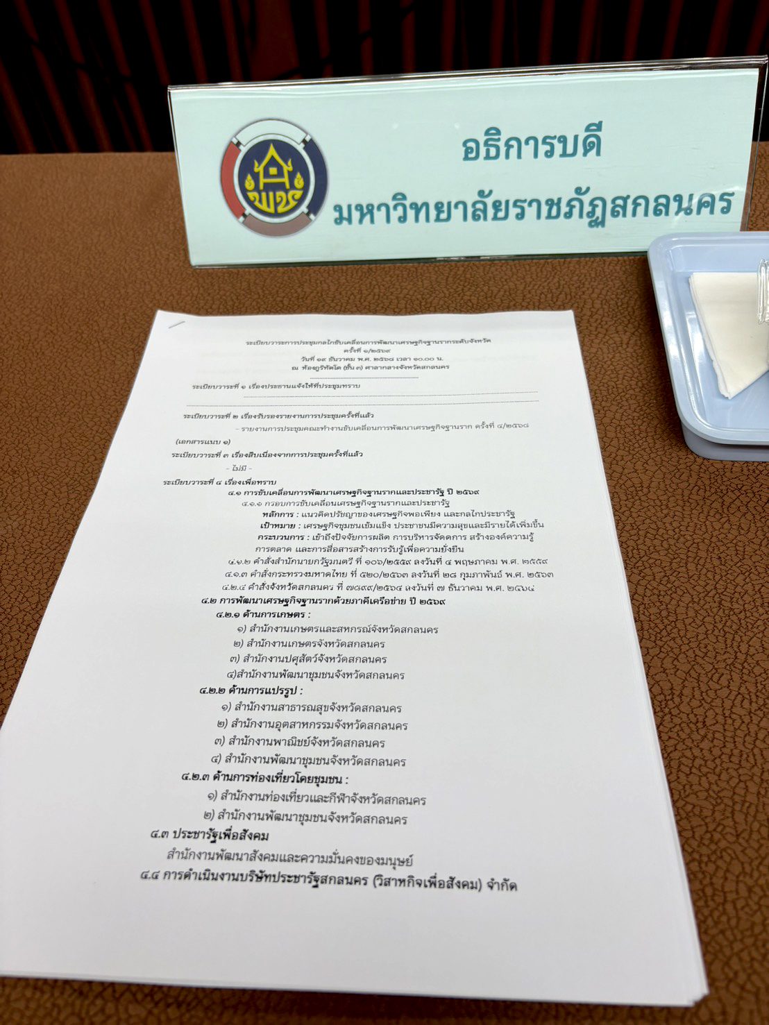 วันศุกร์ที่ 19 ธันวาคม พ.ศ. 2568 เวลา 10.00 น. มหาวิทยาลัยราชภัฏสกลนคร โดย นางสาวเบญจพร มายูร นักวิเคราะห์นโยบายและแผนปฏิบัติการ ได้รับมอบหมายจาก ผู้ช่วยศาสตราจารย์ชาคริต ชาญชิตปรีชา อธิการบดี ให้เข้าประชุมกลไกขับเคลื่อนการพัฒนาเศรษฐกิจฐานรากระดับจังหวัด (คสป.) ครั้งที่ 1/2569 ณ ห้องภูริทัตโต ชั้น 3 ศาลากลางจังหวัดสกลนคร (หลังใหม่) โดย นายศราวุธ สุวรรณจูฑะ รองผู้ว่าราชการจังหวัดสกลนคร เป็นประธานการประชุม จัดโดย สำนักงานพัฒนาชุมชนจังหวัดสกลนคร (พช.)