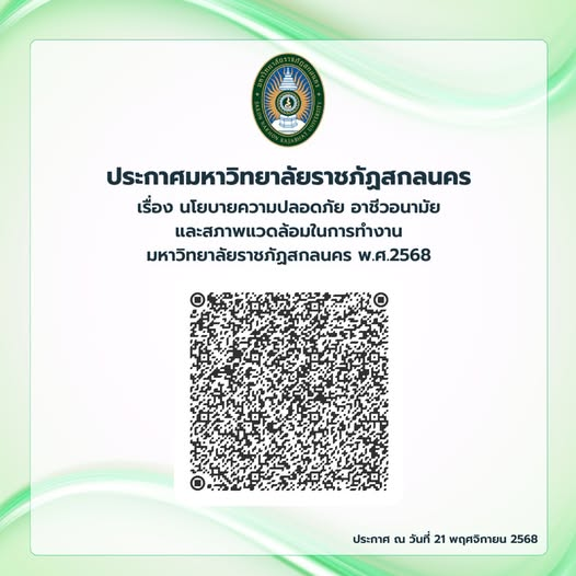 ประกาศมหาวิทยาลัยราชภัฏสกลนคร เรื่อง นโยบายความปลอดภัย อาชีวอนามัย และสภาพแวดล้อมในการทำงาน มหาวิทยาลัยราชภัฏสกลนคร พ.ศ.2568 เผยเเพร่เมื่อ ธันวาคม 26, 2568ธันวาคม 26, 2025 โดย มัลลิกาล์ สินธุระวิทย์ 2 เข้าชม FacebookFacebookXXLINELineShare this: Click to share on X (Opens in new window) X Click to share on Facebook (Opens in new window) Facebook Related