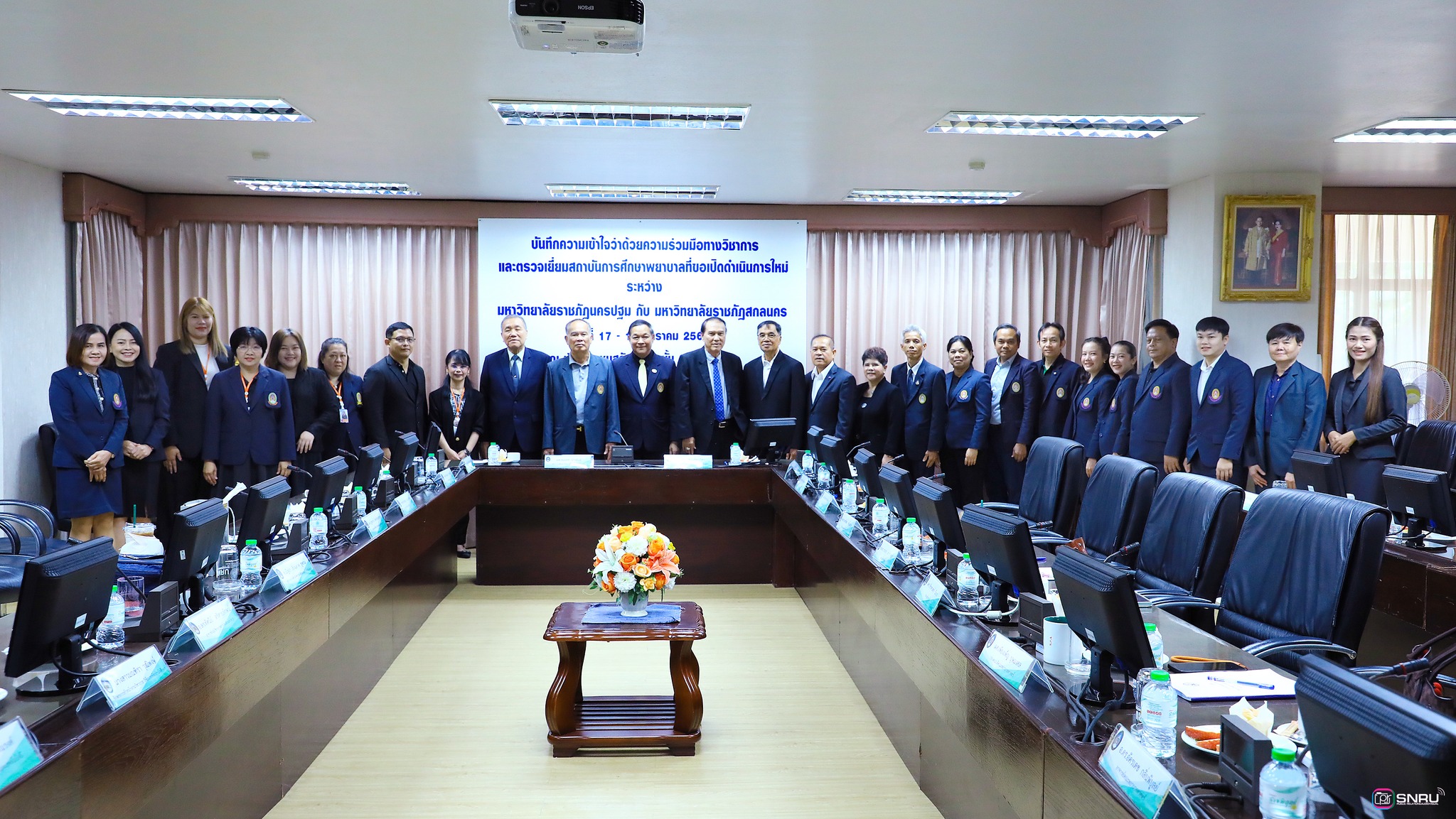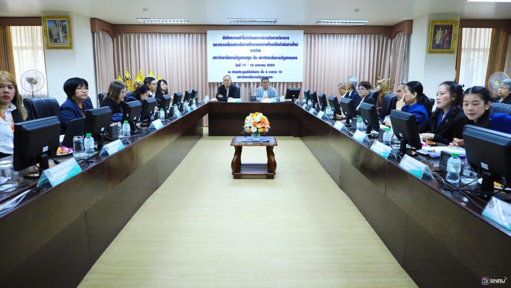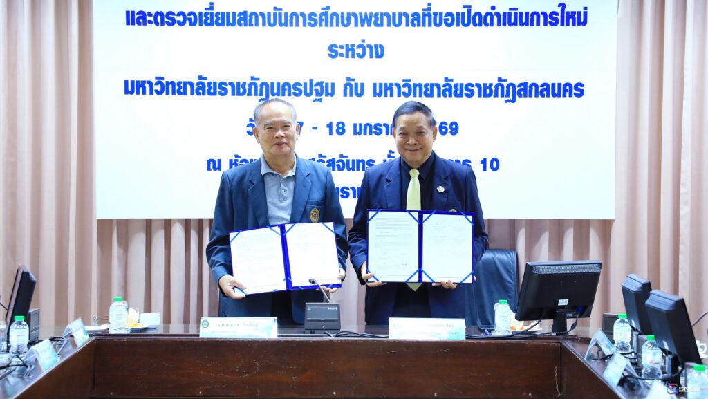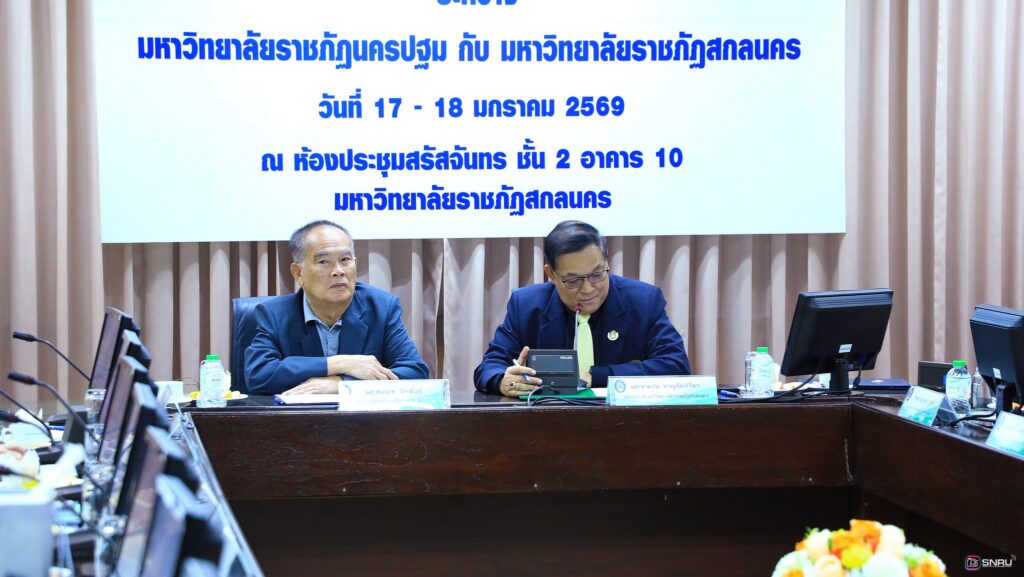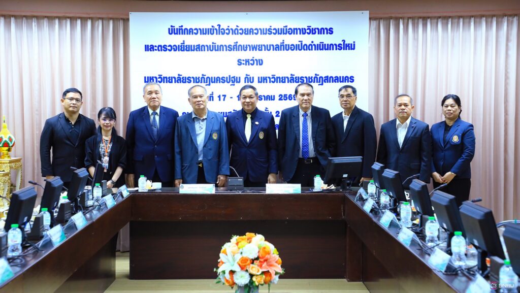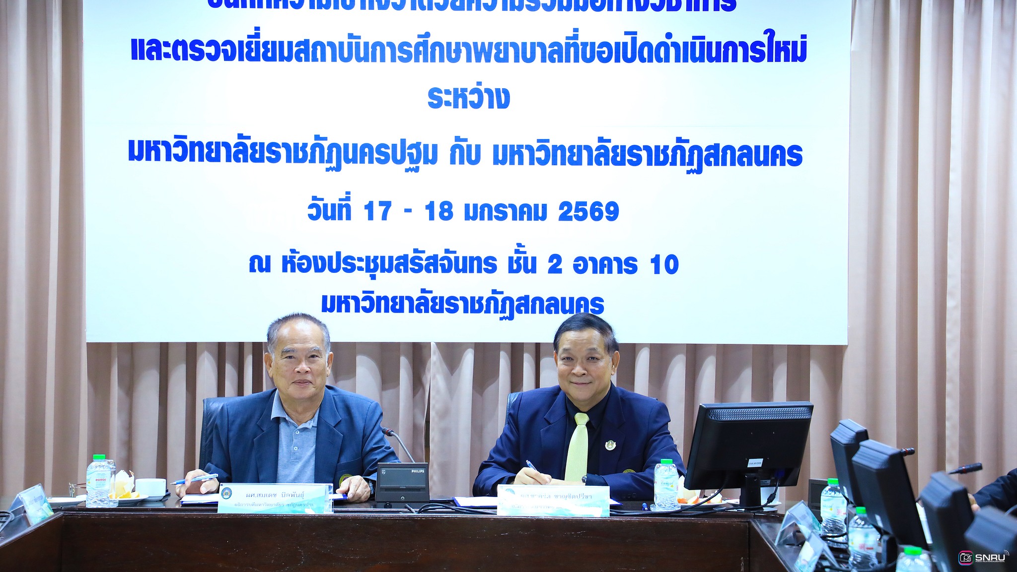 วันที่ 17-18 มกราคม 2569 นายเกษม บุตรดี ผู้อำนวยการสำนักงานอธิการบดี นางสาวพิชญดา ธานี ผู้อำนวยการกองกลาง และนางวาสนา จักรศรี ผู้อำนวยการกองพัฒนานักศึกษา เข้าร่วมเป็นเกียรติในการลงนามบันทึกความเข้าใจว่าด้วยความร่วมมือทางวิชาการ ระหว่างมหาวิทยาลัยราชภัฏสกลนคร ร่วมกับมหาวิทยาลัยราชภัฏนครปฐม โดยคณะพยาบาลศาสตร์เป็นสถาบันการศึกษาพี่เลี้ยงให้แก่ คณะพยาบาลศาสตร์ มหาวิทยาลัยราชภัฏสกลนคร โดยมี ผศ.ชาคริต ชาญชิตปรีชา อธิการบดีมหาวิทยาลัยราชภัฏสกลนคร ลงนามร่วมกับ ผศ.สมเดช นิลพันธ์ อธิการบดีมหาวิทยาลัยราชภัฏนครปฐม ณ ห้องประชุมสรัสจันทร ชั้น 2 อาคาร 10