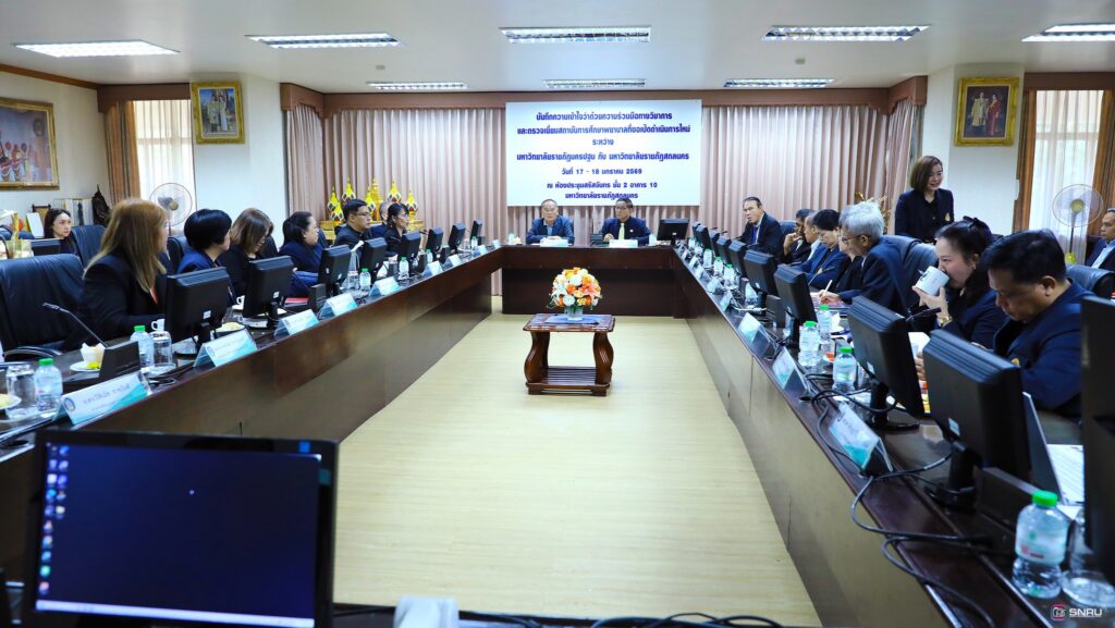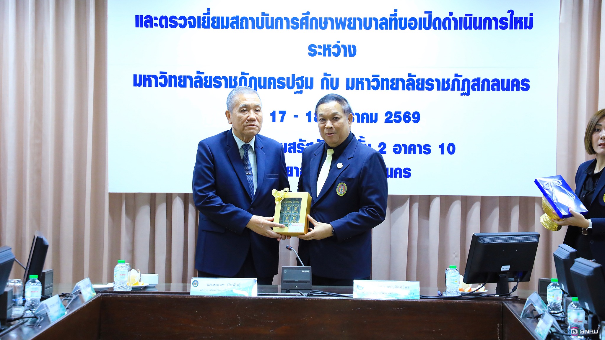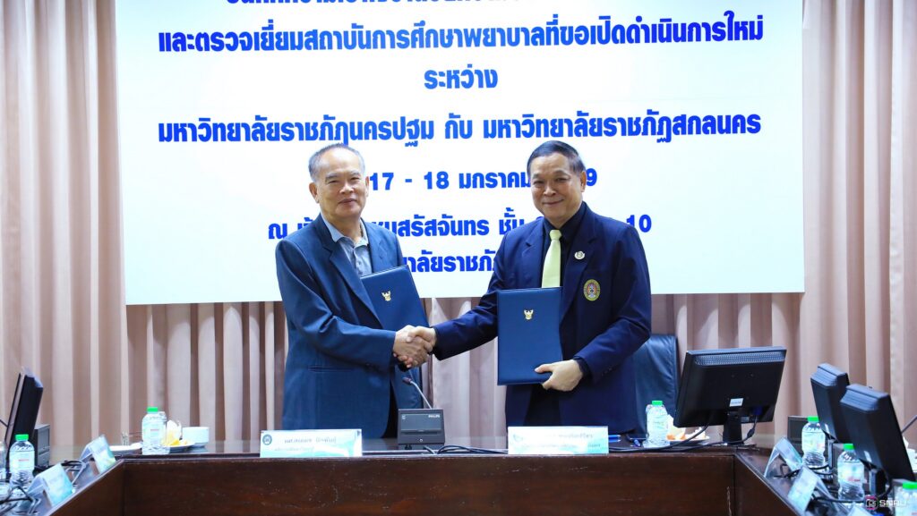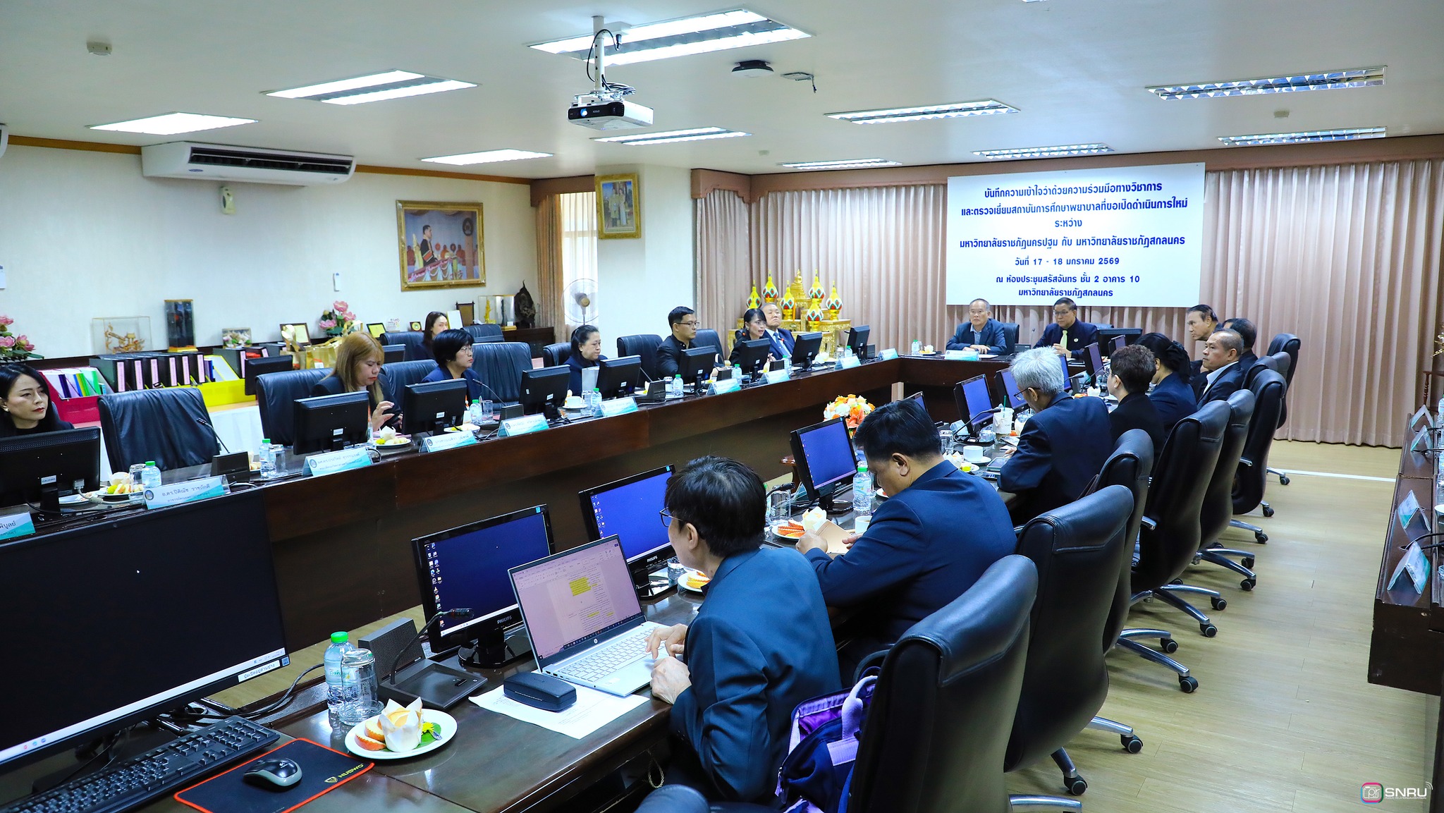วันที่ 17-18 มกราคม 2569 นายเกษม บุตรดี ผู้อำนวยการสำนักงานอธิการบดี นางสาวพิชญดา ธานี ผู้อำนวยการกองกลาง และนางวาสนา จักรศรี ผู้อำนวยการกองพัฒนานักศึกษา เข้าร่วมเป็นเกียรติในการลงนามบันทึกความเข้าใจว่าด้วยความร่วมมือทางวิชาการ ระหว่างมหาวิทยาลัยราชภัฏสกลนคร ร่วมกับมหาวิทยาลัยราชภัฏนครปฐม โดยคณะพยาบาลศาสตร์เป็นสถาบันการศึกษาพี่เลี้ยงให้แก่ คณะพยาบาลศาสตร์ มหาวิทยาลัยราชภัฏสกลนคร โดยมี ผศ.ชาคริต ชาญชิตปรีชา อธิการบดีมหาวิทยาลัยราชภัฏสกลนคร ลงนามร่วมกับ ผศ.สมเดช นิลพันธ์ อธิการบดีมหาวิทยาลัยราชภัฏนครปฐม ณ ห้องประชุมสรัสจันทร ชั้น 2 อาคาร 10