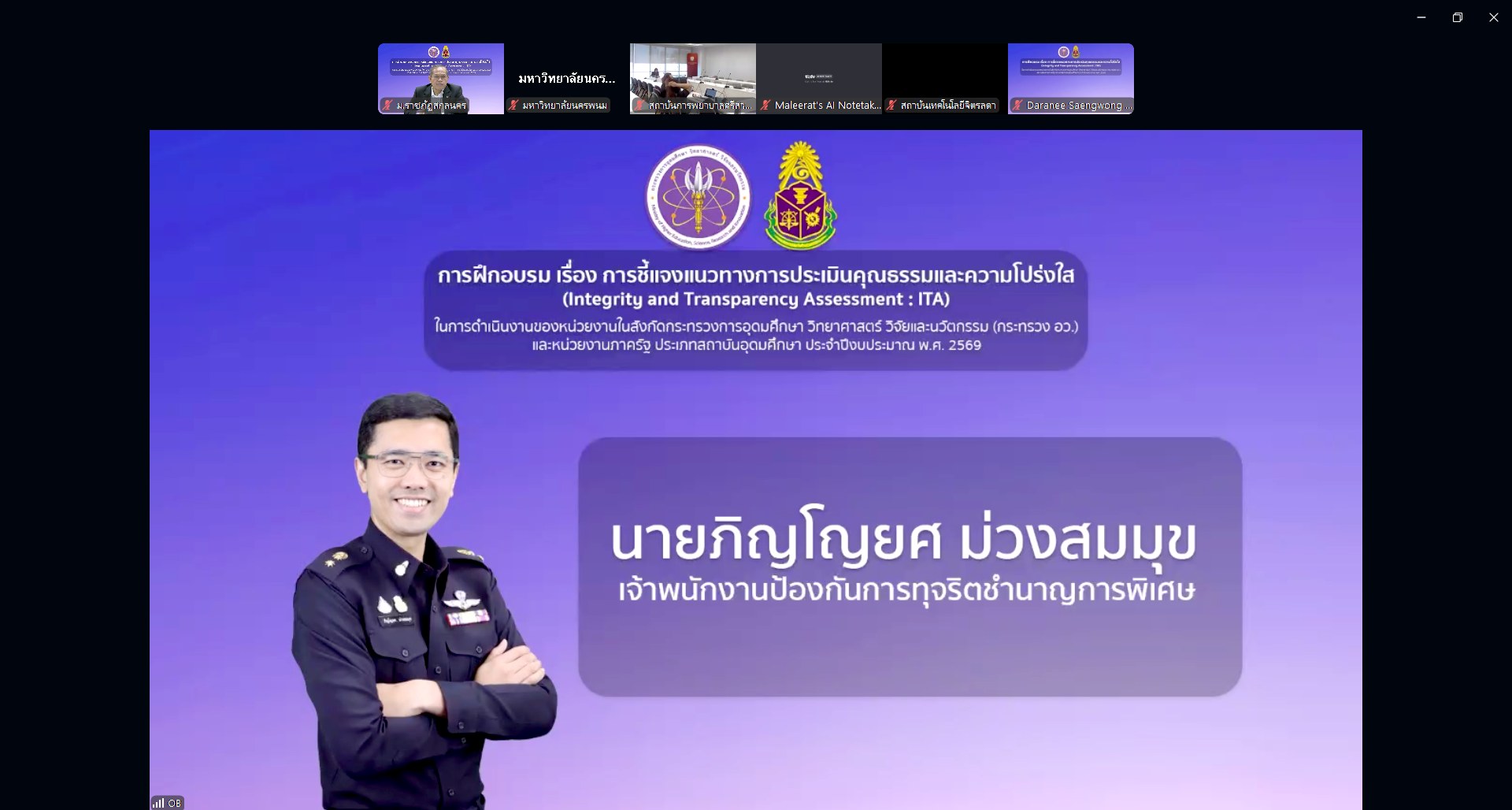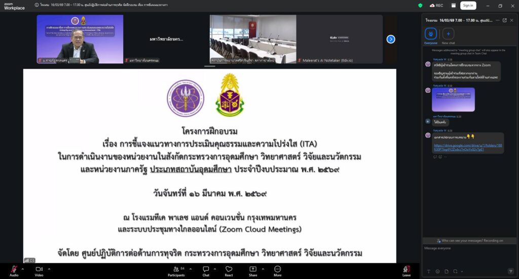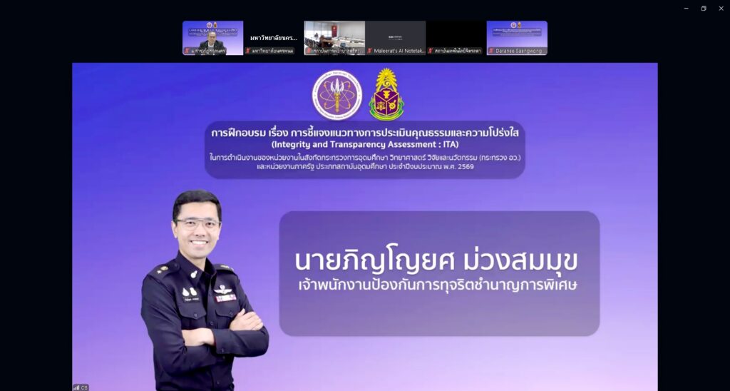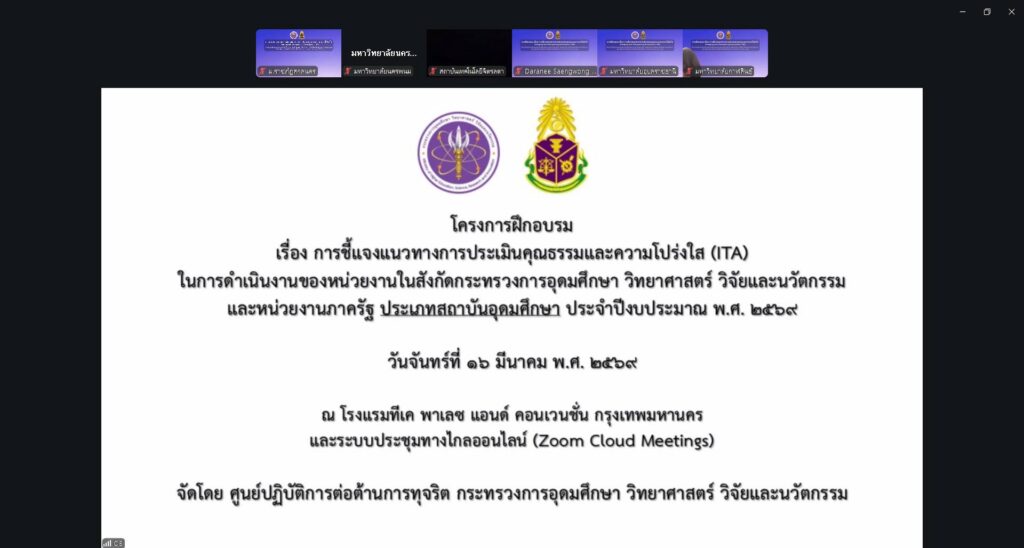 วันจันทร์ที่ 16 มีนาคม พ.ศ. 2569 เวลา 08.30 -16.30 น. มหาวิทยาลัยราชภัฏสกลนคร โดย ศาสตราจารย์ ดร.ทศวรรษ สีตะวัน รองอธิการบดี พร้อมด้วย ดร.พรเทพ เสถียรนพเก้า รองอธิการบดี และคณะทำงาน เข้าร่วมกิจกรรมฝึกอบรม เรื่อง การชี้แจงหลักเกณฑ์การประเมินคุณธรรมและความโปร่งใส (Integrity and Transparency Assessment: ITA) ในการดำเนินงานของหน่วยงานในสังกัดกระทรวงการอุดมศึกษา วิทยาศาสตร์ วิจัยและนวัตกรรม (กระทรวง อว.) และหน่วยงานภาครัฐ ประเภทสถาบันอุดมศึกษา ประจำปีงบประมาณ พ.ศ. 2569 ผ่านระบบประชุมทางไกลออนไลน์ (Zoom Cloud Meetings) ณ ห้องประชุมสรัสจันทร ชั้น 2 อาคาร 10 มหาวิทยาลัยราชภัฏสกลนคร จัดโดย ศูนย์ปฏิบัติการต่อต้านการทุจริต กระทรวงการอุดมศึกษา วิทยาศาสตร์ วิจัยและนวัตกรรม