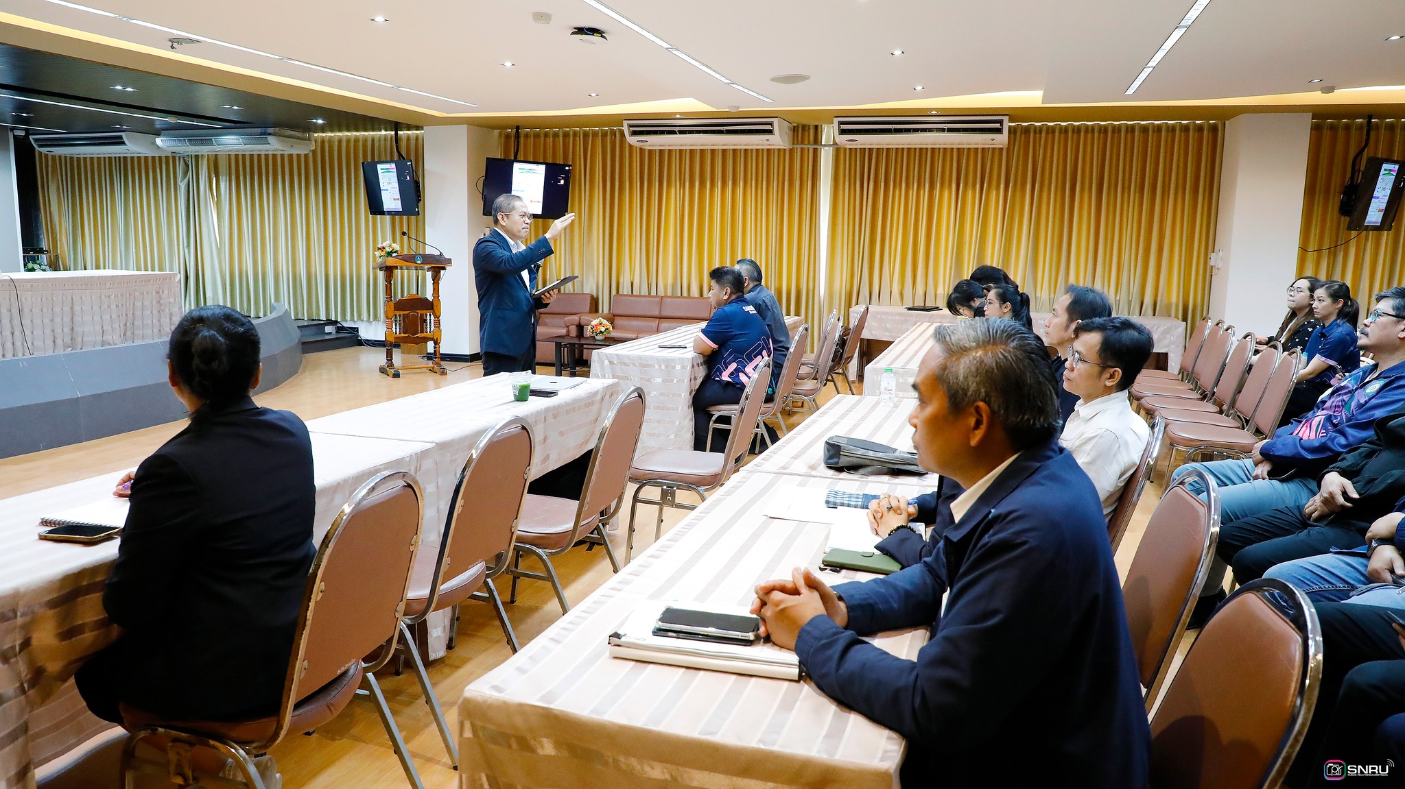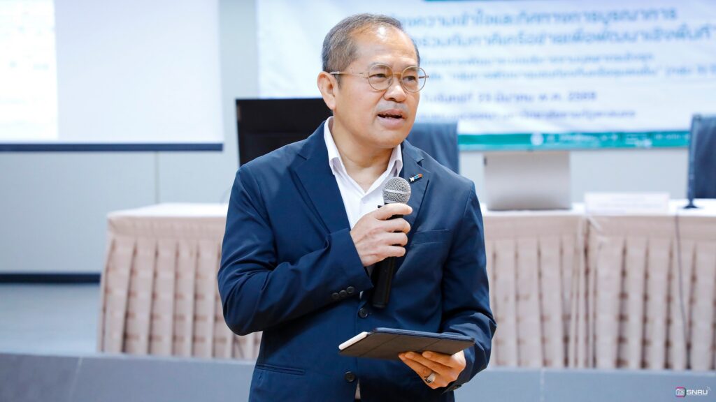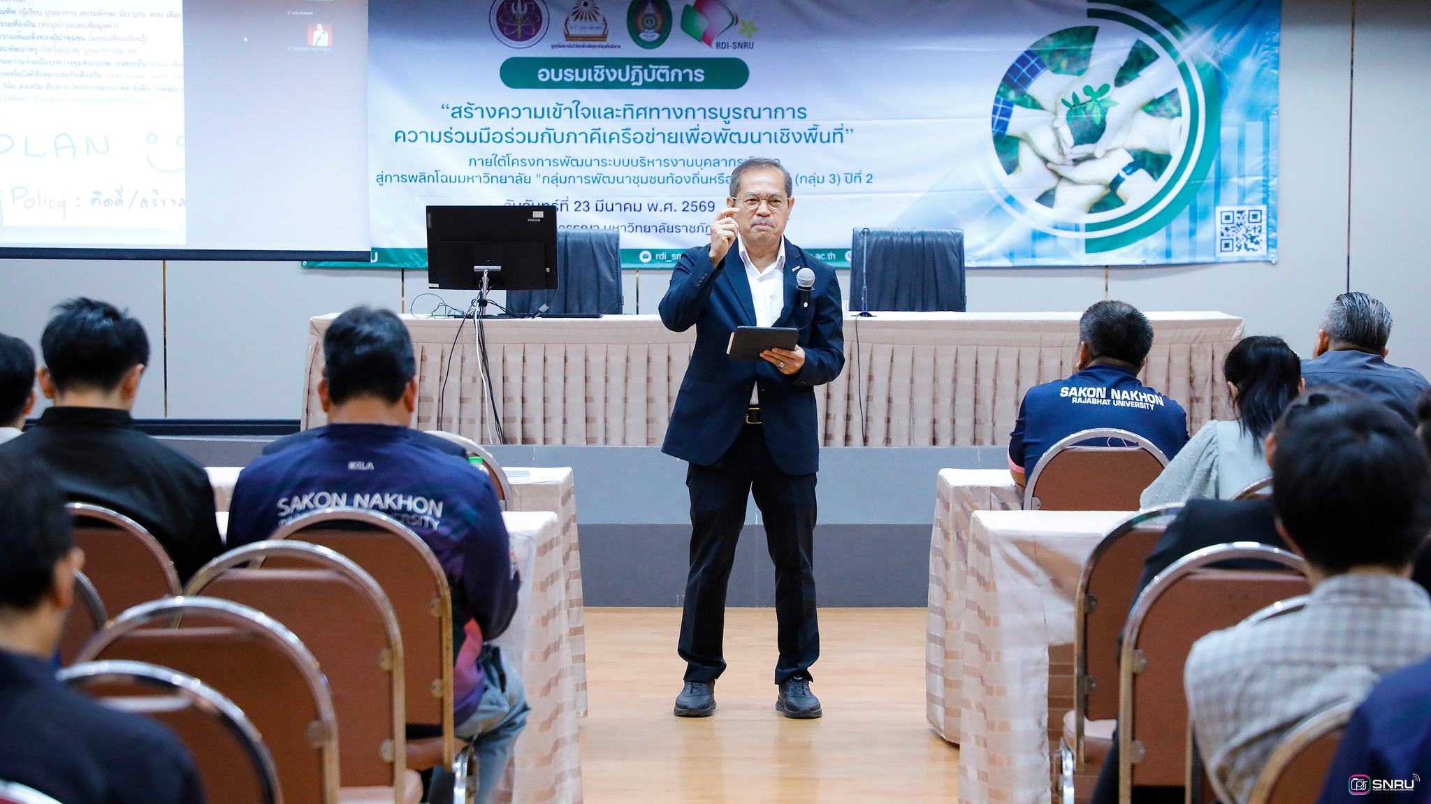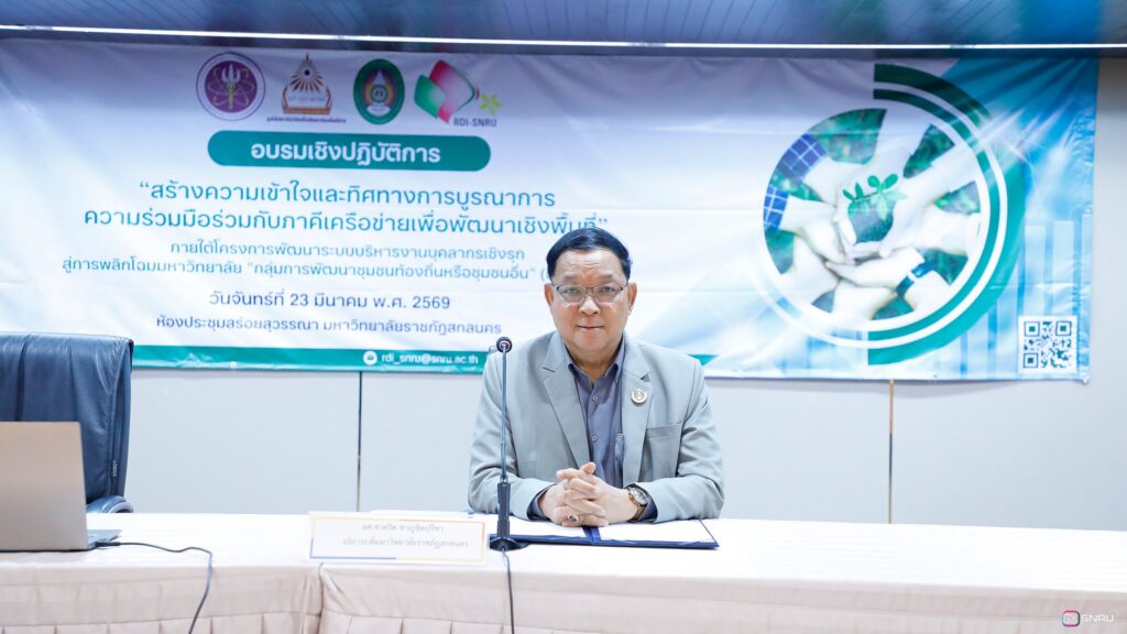 วันที่ 23 มีนาคม 2569 นายเกษม บุตรดี ผู้อำนวยการสำนักงานอธิการบดี เข้าร่วมเป็นเกียรติในพิธีเปิดการอบรมเชิงปฏิบัติการ เรื่อง “การสร้างความเข้าใจและทิศทางการบูรณาการความร่วมมือร่วมกับภาคีเครือข่ายเพื่อพัฒนาเชิงพื้นที่” ณ ห้องประชุมสร้อยสุวรรณา อาคาร 10 มหาวิทยาลัยราชภัฏสกลนคร จัดโดยสถาบันวิจัยและพัฒนา มหาวิทยาลัยราชภัฏสกลนคร โดย ผศ.ชาคริต ชาญชิตปรีชา อธิการบดี กล่าวเปิดการอบรม และ อาจารย์อรอนงค์ ขันเดช รองผู้อำนวยการสถาบันวิจัยและพัฒนา กล่าวรายงาน พร้อมกันนี้ ศ.ดร.ทศวรรษ สีตะวัน รองอธิการบดี ได้บรรยาย เรื่อง “บทบาทมหาวิทยาลัยราชภัฏสกลนครกับภาคีเครือข่ายเพื่อพัฒนาเชิงพื้นที่ ตามยุทธศาสตร์มหาวิทยาลัยราชภัฏเพื่อพัฒนาท้องถิ่น” เพื่อสร้างความเข้าใจเกี่ยวกับบทบาทสำคัญในการเป็นสถาบันอุดมศึกษาเพื่อการพัฒนาท้องถิ่น และกำหนดทิศทางการดำเนินงานร่วมกัน จากนั้นเป็นการแบ่งกลุ่มปฏิบัติการเพื่อวิเคราะห์ประเด็นปัญหาภาคีเครือข่าย