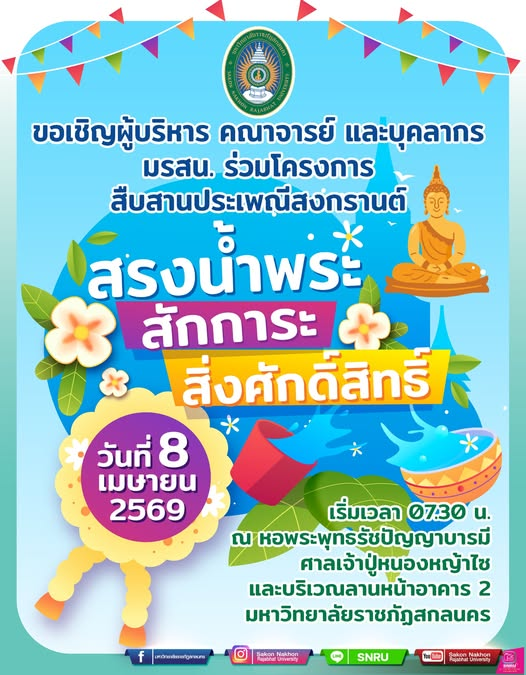 ในวันที่ 8 เมษายน 2569 ณ ลานอเนกประสงค์ หน้าอาคาร 2 มหาวิทยาลัยราชภัฏสกลนคร ตั้งแต่เวลา 07.30 น . เป็นต้นไป