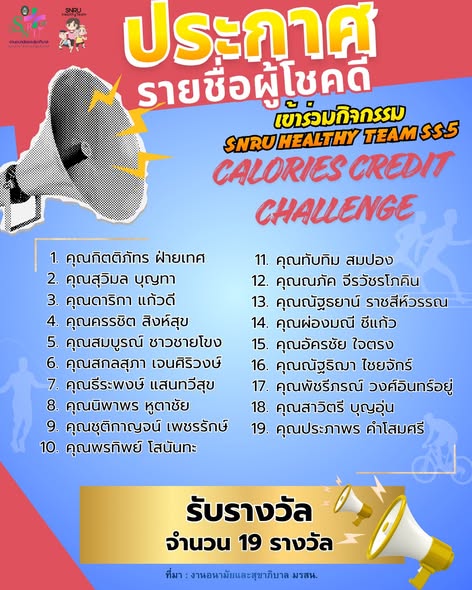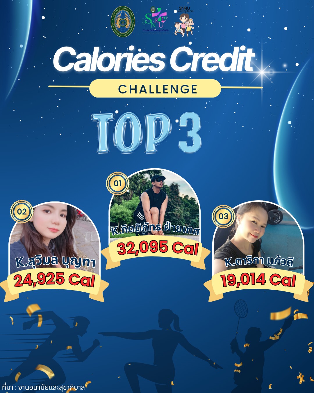 งานอนามัยและสุขาภิบาล กองพัฒนานักศึกษา สำนักงานอธิการบดี มหาวิทยาลัยราชภัฏสกลนคร ขอขอบพระคุณคณะผู้บริหาร และบุคลากรทุกท่านที่ได้ให้ความสนใจและเข้าร่วมกิจกรรม “SNRU Healthy Team Season 5” ทั้งกิจกรรมเต้นแอโรบิก และ กิจกรรมสะสมพลังงานการเผาผลาญแคลอรี่ ภาพความมุ่งมั่นและความสนุกสนานของทุกท่าน คือหัวใจสำคัญที่ทำให้โครงการนี้บรรลุวัตถุประสงค์ ไม่เพียงแต่ร่างกายที่แข็งแรงขึ้น แต่ยังได้เห็นรอยยิ้มและการสร้างสัมพันธภาพที่ดีระหว่างบุคลากรในมหาลัย โดยบุคลากรของสำนักงานอธิการบดี นายกิตติภัทร ฝ่ายเทศ บุคลาการสังกัดงานประชาสัมพันธ์ กองกลาง สำนักงานอธิการบดี ได้เป็นลำดับที่ 1 ในการเข้าร่วมกิจกรรม Calories Credit Challenge