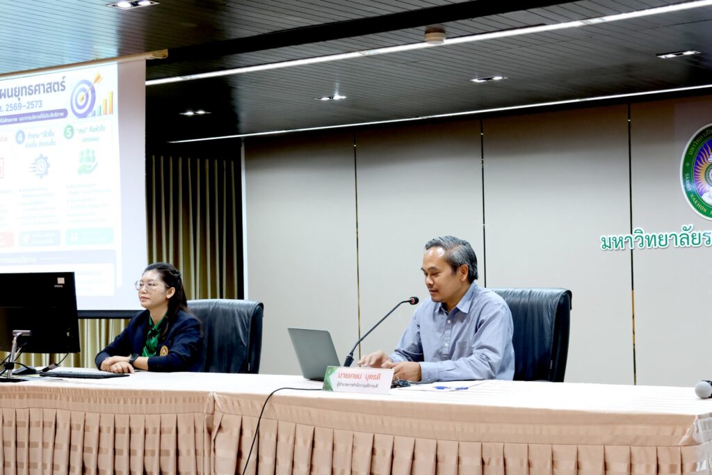วันศุกร์ที่ 24 เมษายน พ.ศ. 2569 เวลา 09.30 น. สำนักงานอธิการบดี จัดประชุมเพื่อพิจารณาและให้ข้อเสนอแนะต่อร่างแผนยุทธศาสตร์สำนักงานอธิการบดี ณ ห้องประชุมสร้อยสุวรรณา ชั้น 3 อาคาร 10 มหาวิทยาลัยราชภัฏสกลนคร โดย นายเกษม บุตรดี ผู้อำนวยการสำนักงานอธิการบดี เป็นประธานการประชุม โดยมีวัตถุประสงค์เพื่อระดมความคิดร่วมพิจารณาทบทวนและให้ข้อเสนอแนะ (ร่าง) แผนยุทธศาสตร์สำนักงานอธิการบดี ระยะ 5 ปี (พ.ศ. 2569 – 2573) เพื่อการจัดทำแผนยุทธศาสตร์สำนักงานอธิการบดี ระยะ 5 ปี (พ.ศ. 2569 – 2573) เป็นไปด้วยความเรียบร้อยและบรรลุตามวัตถุประสงค์