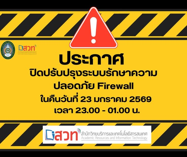 สำนักวิทยบริการและเทคโนโลยีสารสนเทศ มีการอัพเดทและปรับปรุงระบบรักษาความปลอดภัยหลักของมหาวิทยาลัย ( Firewall ) ในคืนวันที่ 23 มกราคม 2569 เวลา 23.00 – 01.00 น.