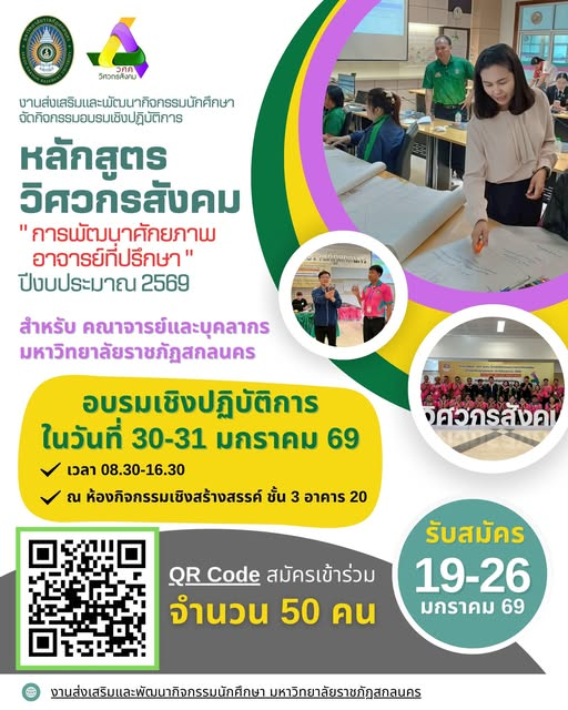 เชิญคณาจารย์และบุคลากร มหาวิทยาลัยราชภัฏสกลนคร สมัครเข้าร่วม อบรมเชิงปฏิบัติการ หลักสูตร วิศวกรสังคม “การพัฒนาศักยภาพอาจารย์ที่ปรึกษา” ตั้งแต่วันนี้ ถึง 26 มกราคม 2569 จำนวน 50 คน