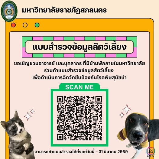 มรสน. ขอเชิญชวนอาจารย์ และบุคลากร ที่มีบ้านพักภายในมหาวิทยาลัย ร่วมทำแบบสำรวจข้อมูลสัตว์เลี้ยง ในการดำเนินการฉีดวัคซีนป้องกันโรคพิษสุนัขบ้า เพื่อสร้างความปลอดภัยให้แก่นักศึกษา บุคลากร และประชาชนที่เข้ามาใช้บริการพื้นที่ภายในมหาวิทยาลัย