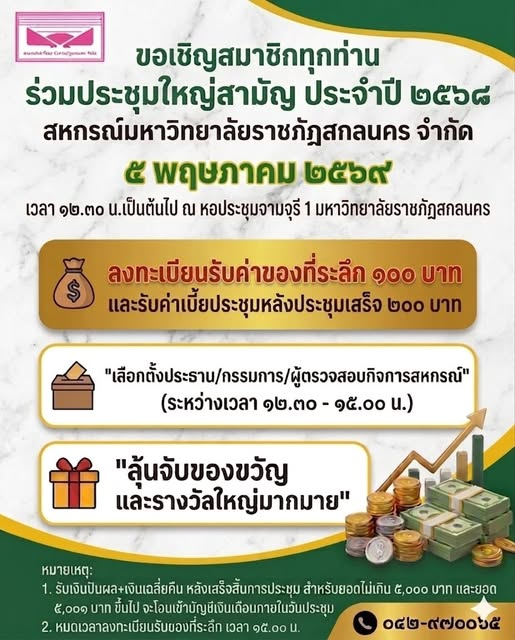 ขอเชิญสมาชิกสหกรณ์มหาวิทยาลัยราชภัฏสกลนคร เข้าร่วมประชุมใหญ่สามัญ ประจำปี 2569